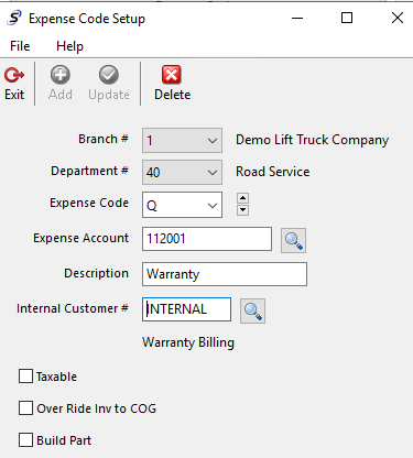 You will want to create an expense code for warranty items to be expensed internally. This is done so that the work order is not flagged as a customer sale and is instead expensed internally to the warranty customer and to their warranty AR account. This is set up by creating an expense code to warranty receivables GL account under the warranty customer number.