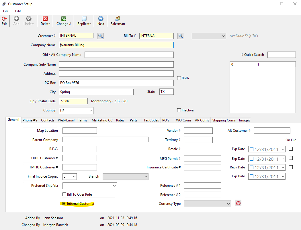 First, you will need to have a warranty customer identified and set up in the system. Typically, this customer will be designated as both an internal and external customer in the setup, as seen below.