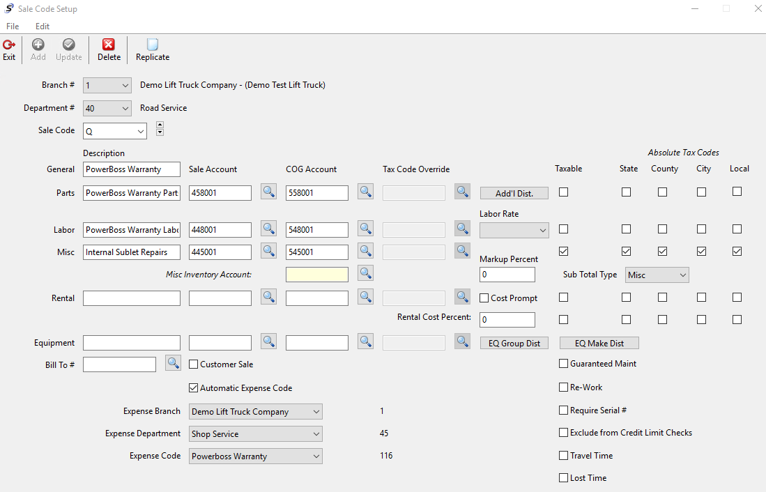 After creating the expense code, then, you will also want to create a sales code for the warranty items. You will make sure, when setting up the warranty, that the flag is not checked for customer sale so this sale type is not seen as a customer sale. Example below: