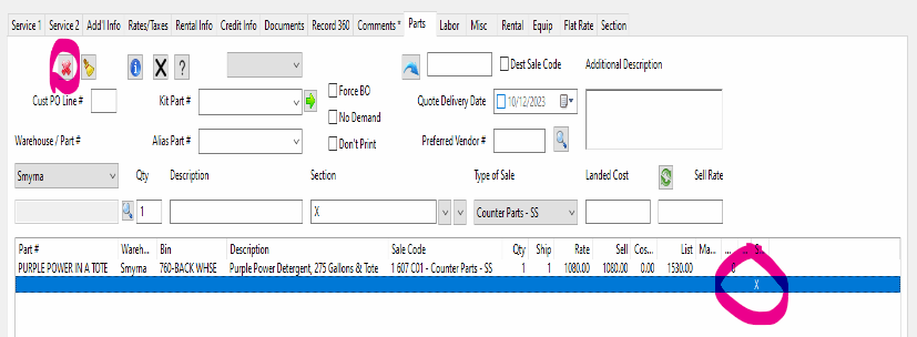 You should see the failure on a blank line with an X in the section column. It can be hard to see, but I included a screenshot below. You will need to highlight that line and delete it and then verify the parts on the order and add it back as needed.