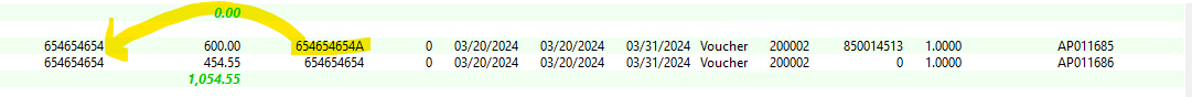 For this scenario, I can take my invoice 654654654A and update the apply to value to match the original invoice.  There is a knowledge article on this process. You will highlight the invoice in AP inquiry, and the field that appears at the top 'Apply to #' can be changed at will.  Remove the A, and you are left with 654654654.  Click okay.  Now you see both lines in that original invoice number.  It is also available as one singular invoice to pay in AP payments under that original number.