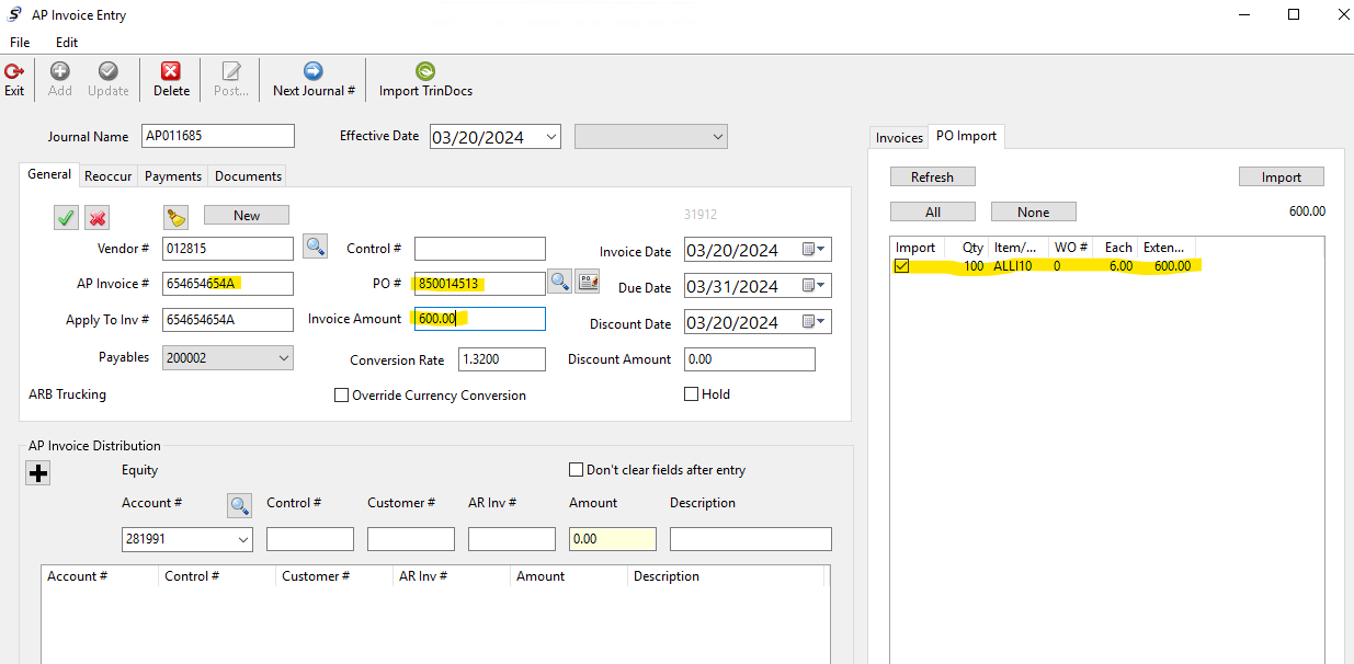 For this example, I have a vendor 012815 where I ordered/received 100 of part Alli10 on PO 850014513, and 100 of part Alli3 on PO 850014515. The vendor sent me one invoice for both on invoice 654654654.