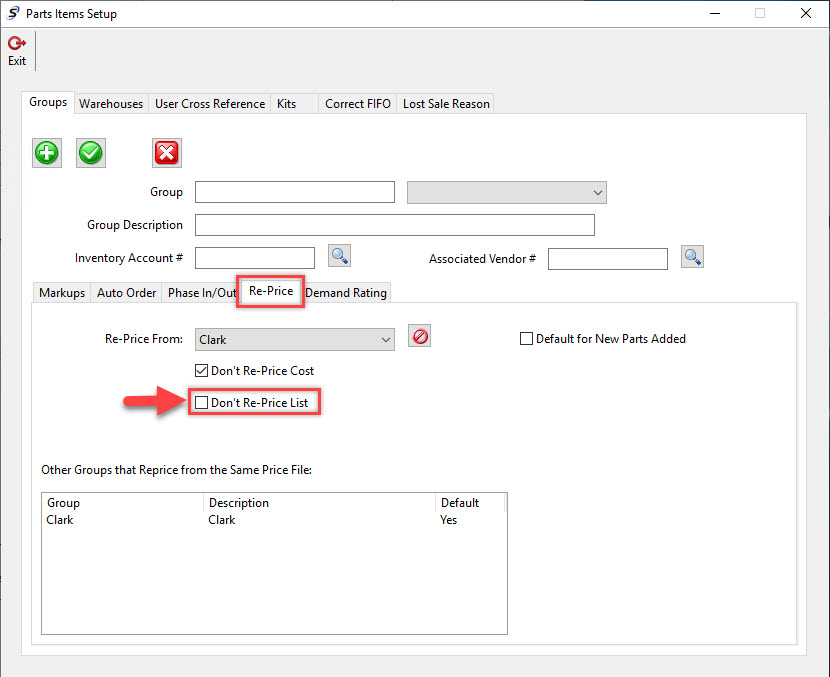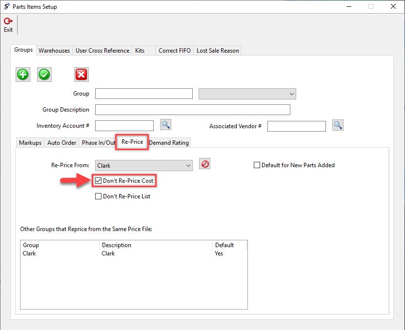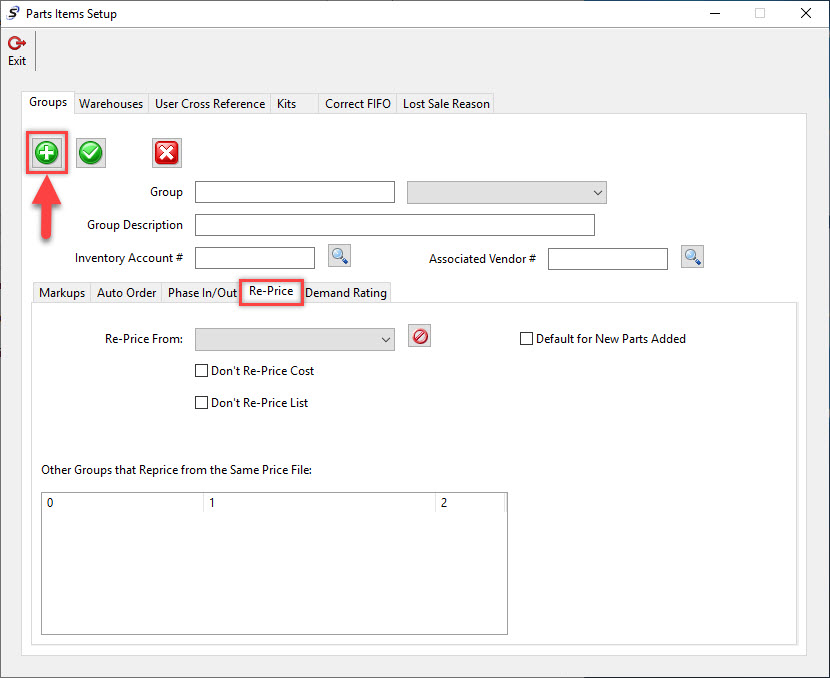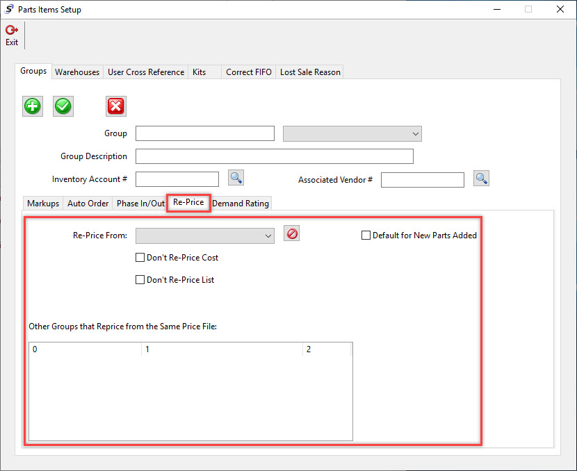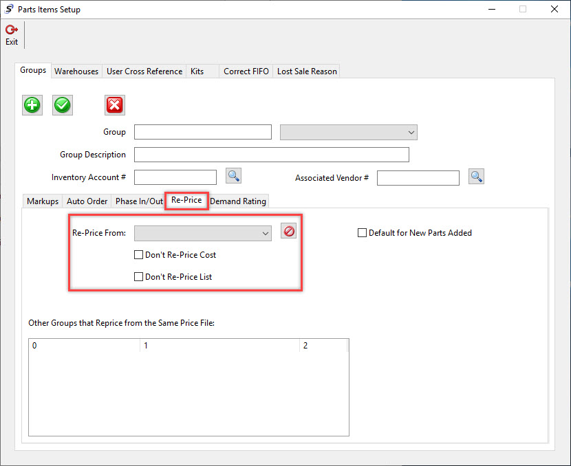 The "Re-price" tab inside Parts Items Setup option offers several options to customize the re-pricing process: