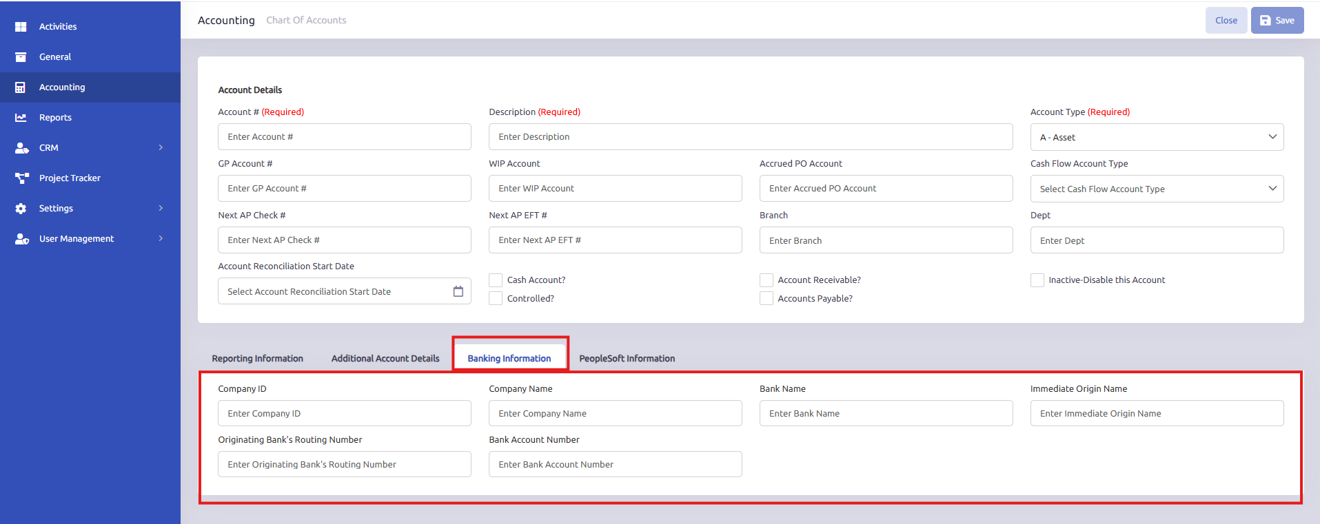- Populate the fields on the Banking Information Tab on the Chart of Account record for your Bank Account.