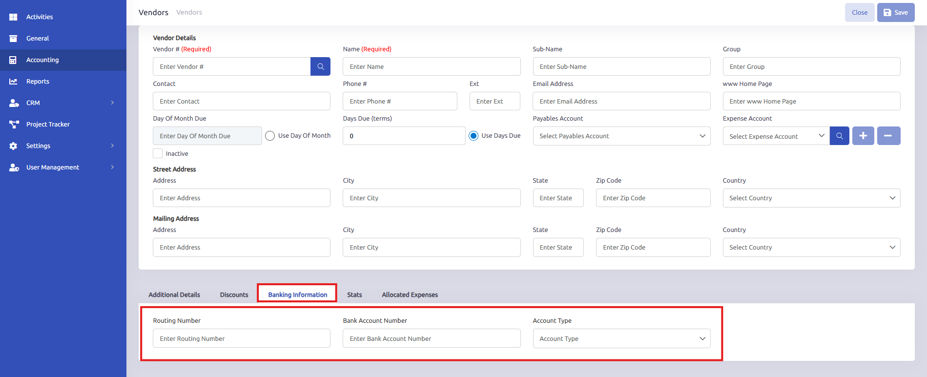 - Populate the fields on the Banking Information Tab on the Vendor record.