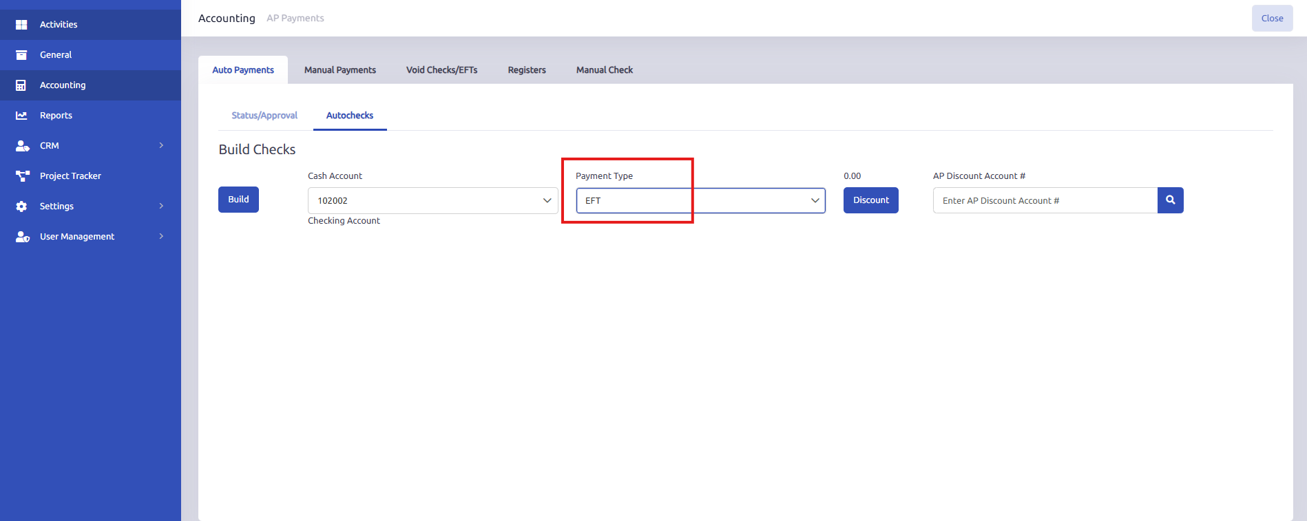 - In the Auto Check Tab we recommend to use the Payment Type of EFT for the Bank Account that you want to generate the NACHA file for as you aren't actually printing any Checks for the ACH Payments that would be sent in the NACHA File.
