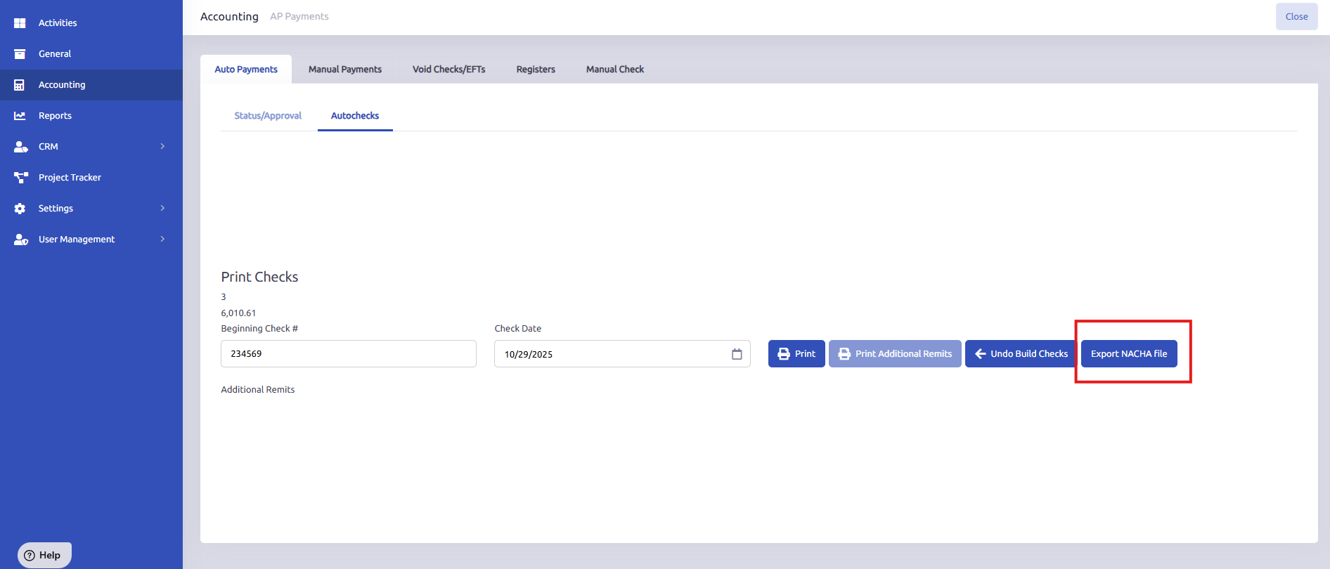 - Go to Accounting -> AP Payments and select the Auto Payments Tab, Authorize the AP Invoices you wish to pay and then choose the Auto Check Tab.