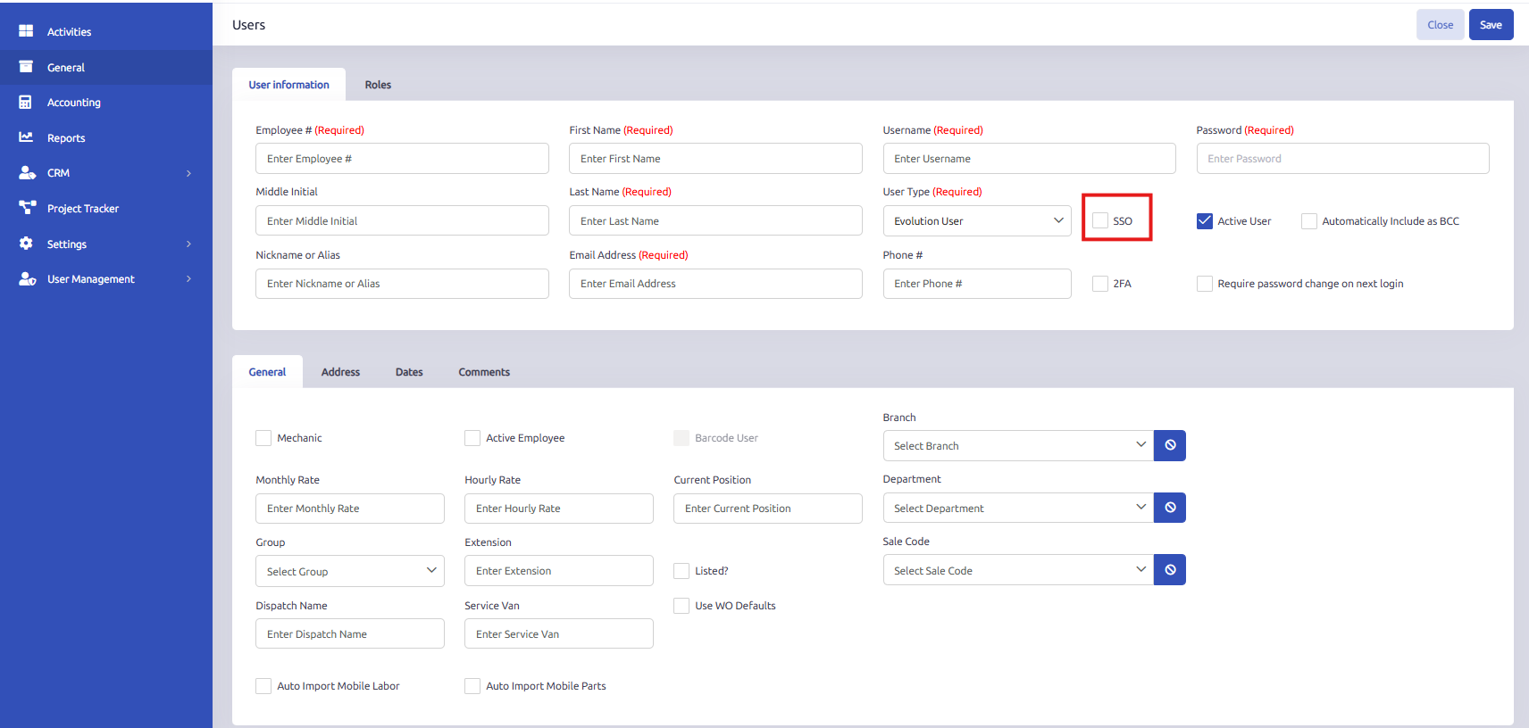 - Once the Microsoft Entra SSO feature is turned on in Evolution, go to User Management -> Users and set the SSO checkbox to checked on the users you want login with Microsoft Entra SSO.