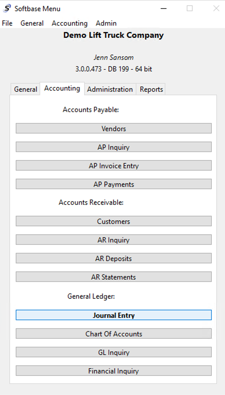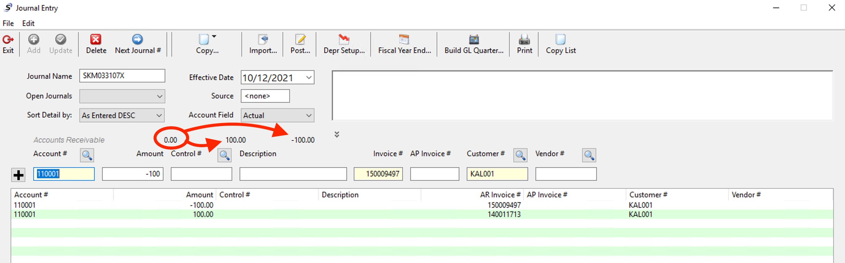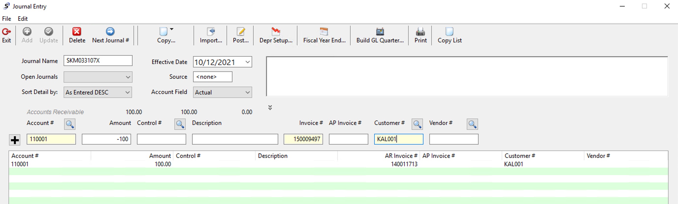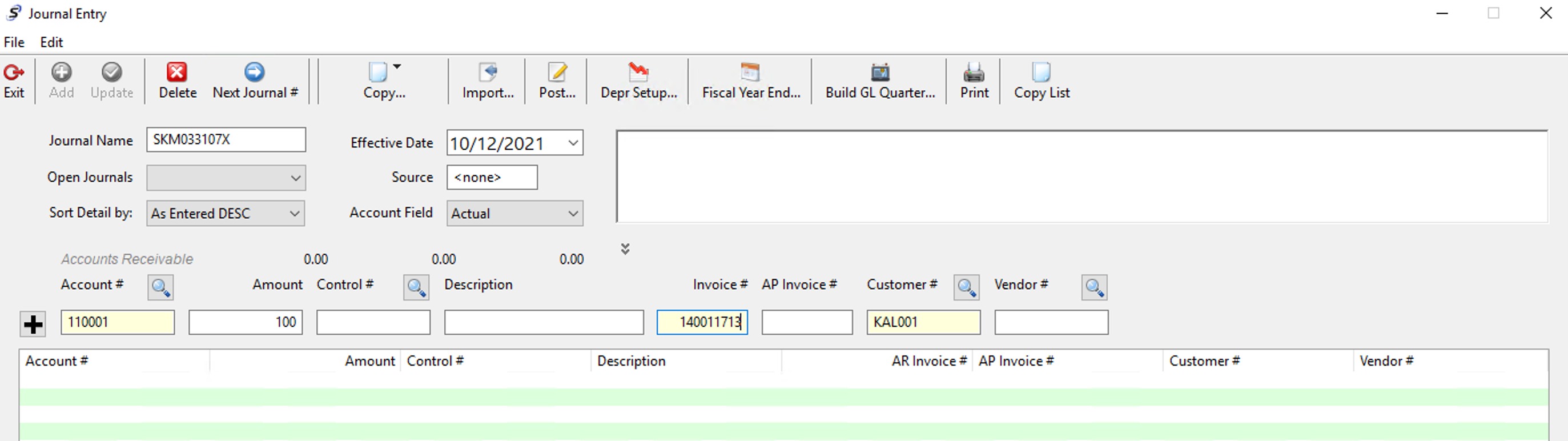 Enter the amount of the line item you want to post. Click the black plus sign button to add the line item. If you are posting to a controlled account the appropriate fields will be highlighted in yellow to indicate what the account is controlled by. For example if you are posting to Accounts Receivable the Invoice # and Customer # fields will be yellow, likewise if you are posting to Accounts Payable the AP Invoice # and Vendor # fields will be yellow indicating those are required. If you are posting to any other controlled account the Control # field will be yellow, for example if you are posting to New Equipment Inventory the control # would be the control # be whatever number is assigned to that equipment record for which you are posting an entry.