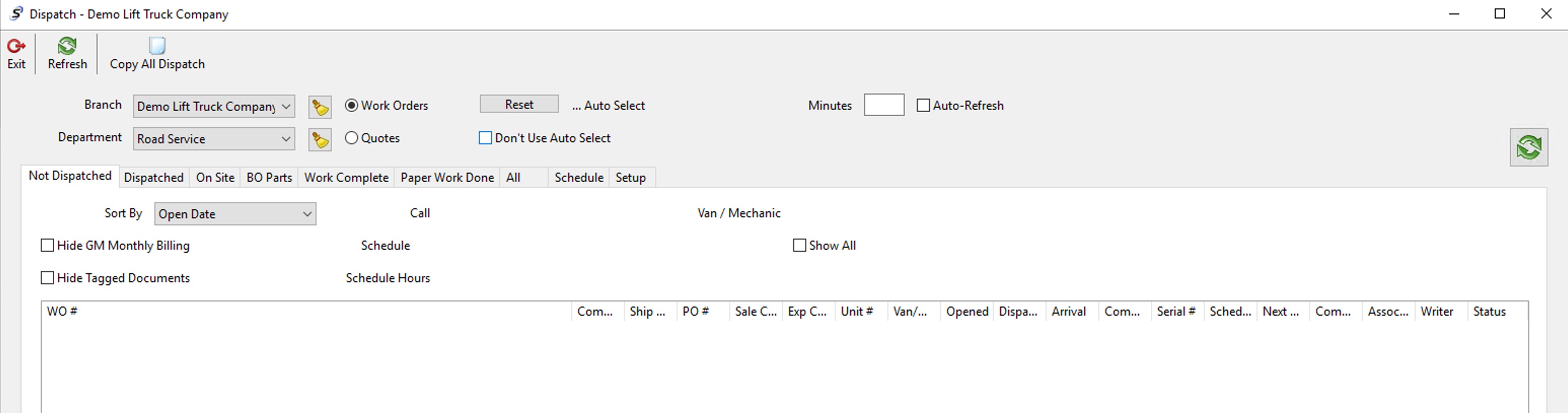 Branch - This field is where the user may filter by branch to determine what data will be displayed in the Dispatch window.