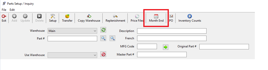 The Month End Button on the Parts Window is used to move the Sales, Demand, Bin Trips and Lost Sales to the previous buckets so that the current month can be opened up to track the usage of parts for the current month.