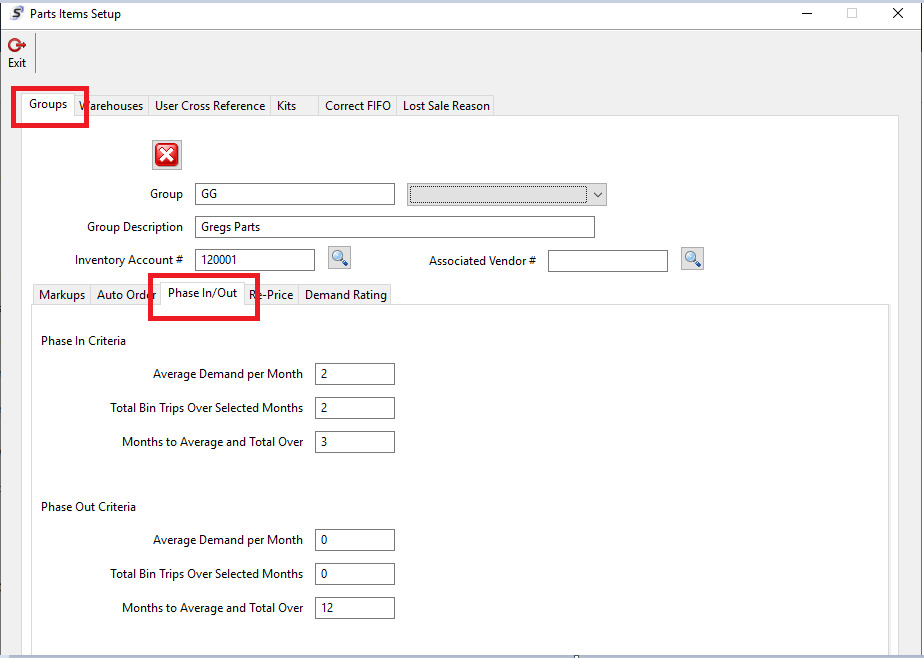 When the Parts Month End Process runs it will look at the Part Group for each Part to gather the above information to determine if a part could be phased in or out.