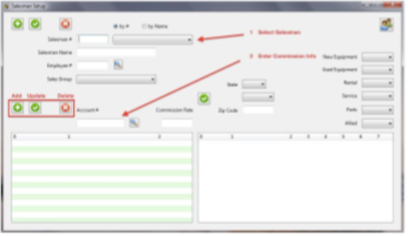 Begin by selecting a salesman from the drop down box in the salesman setup section.  Then in the bottom left section you will enter the appropriate information for figuring commissions.