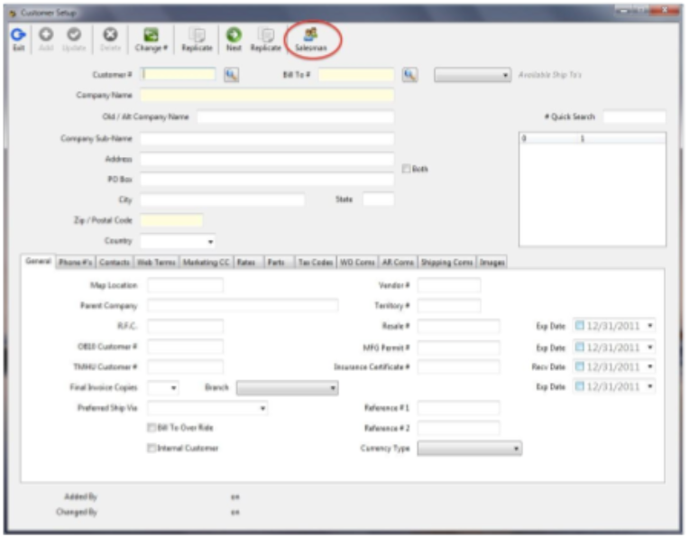 Now in this screen the Salesman # is going to actually be the “Territory” #.  This makes it much easier to rearrange territories within the customer base in the program if the need arises.