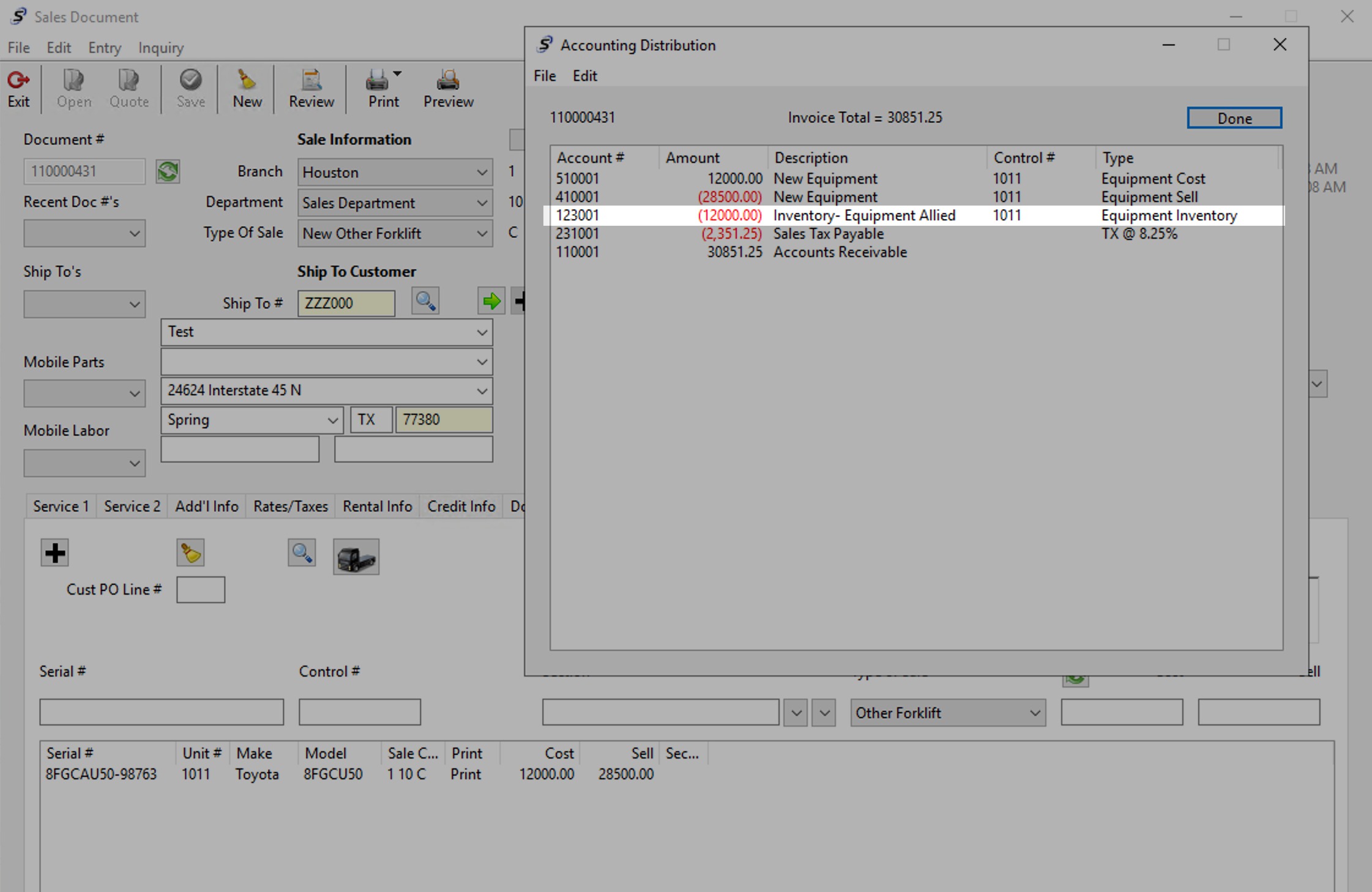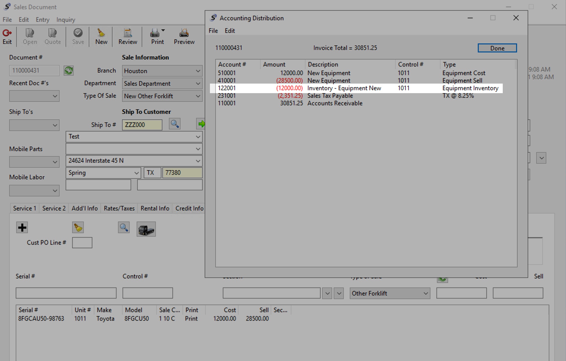 If you were to sell this equipment with the over-ride account number in the equipment setup it would relieve the over-ride account number instead of the default inventory account