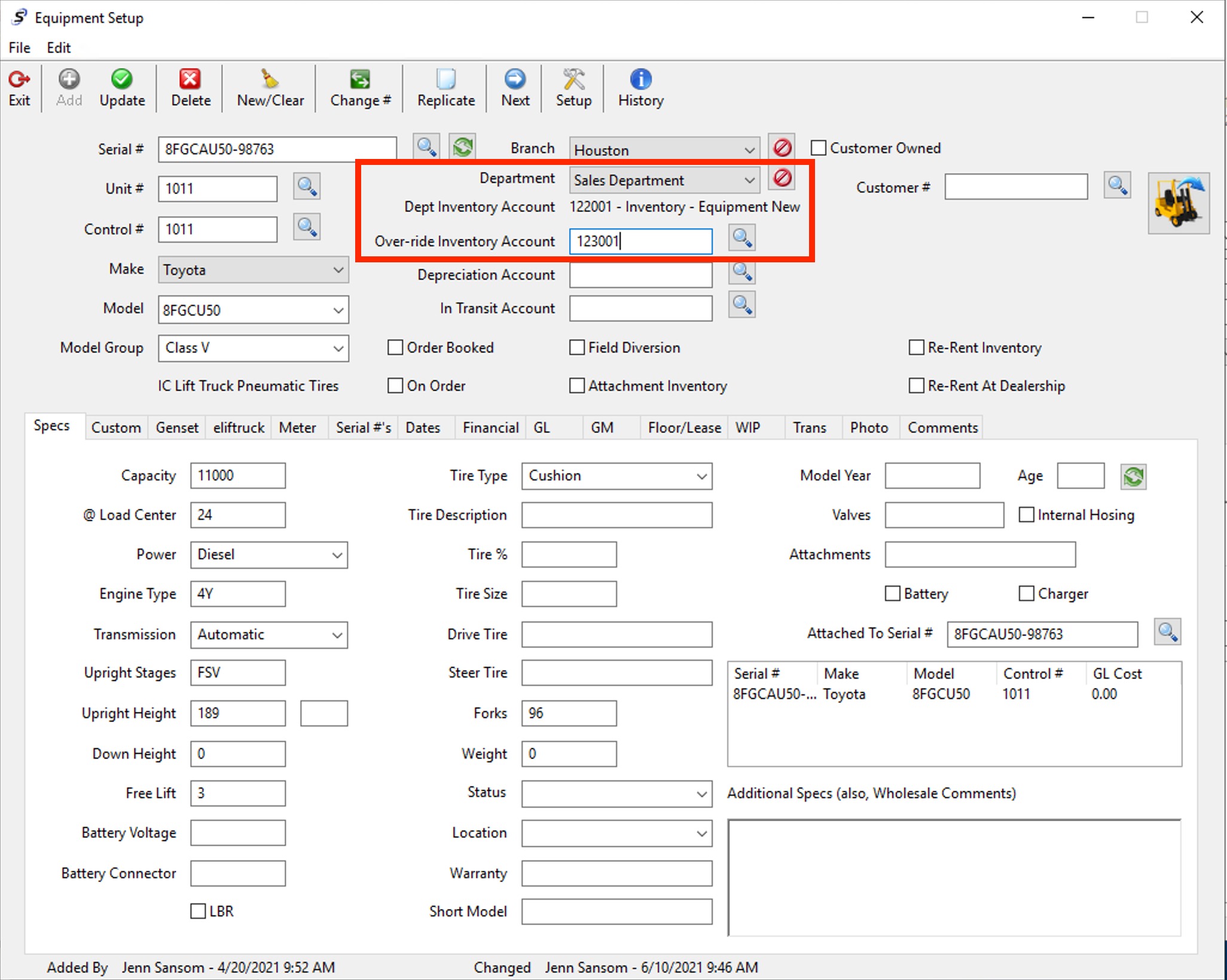 However if there is a different account number in the over-ride inventory account field this will be used instead of the default inventory account for the department to determine what inventory account is to be relieved when selling the equipment.