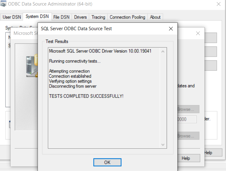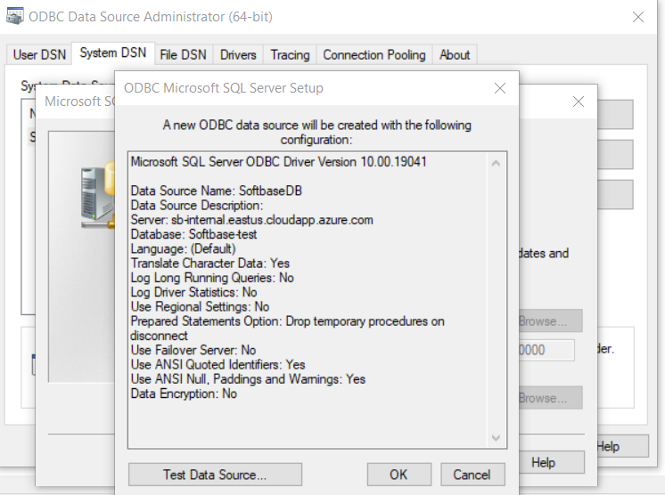 9. After selecting Finish you will see the below screen and you can choose the "Test Data Source" button to ensure the connection is good, otherwise you can choose OK to complete the setup and login to Softbase.