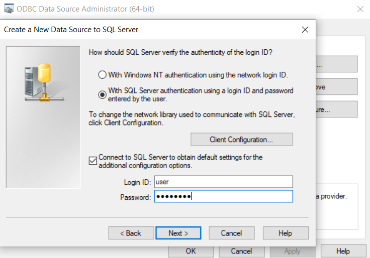 - Change the Radio button to the option to authenticate with SQL Server authentication, not Windows NT.