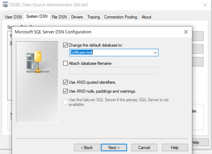7. Once you authenticate in SQL you will need to ensure that the Default Database dropdown option on the below form is selected to be your Softbase SQL Database.