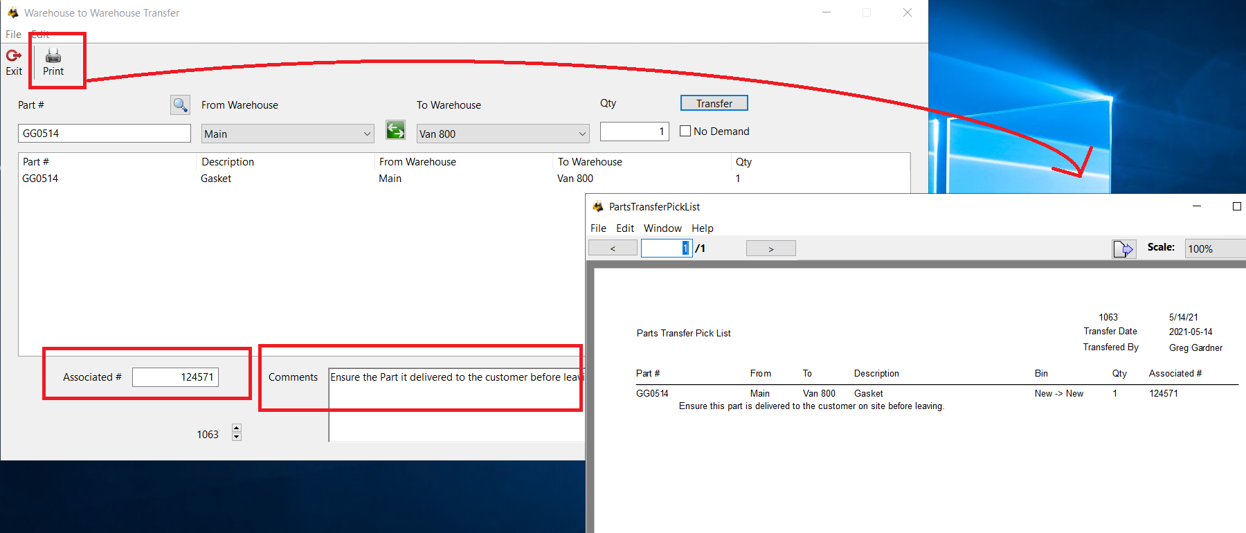 - When a user chooses the Transfer button from the Parts Window to perform a transfer of a part from one warehouse to another, if they choose to enter the Associated Work Order Number or Comments on the form, when they print out the Parts Transfer Pick List Report they will now see those fields on the report.