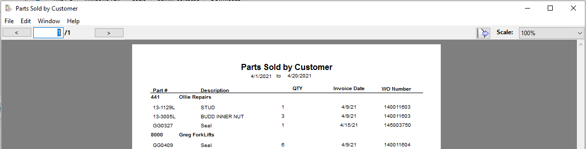 The Parts Sold report provides a list of parts sold between your provided date range grouped by customer.