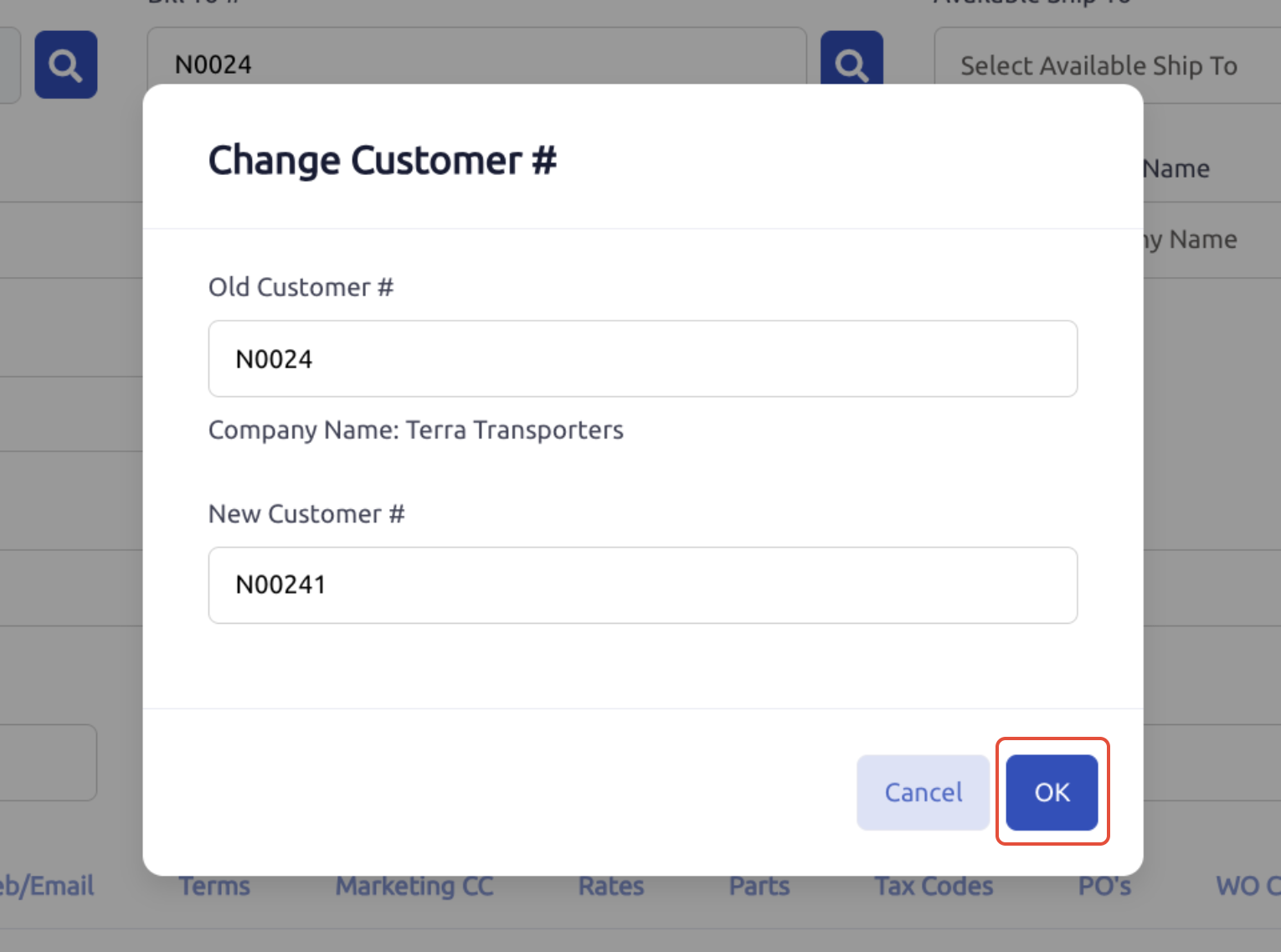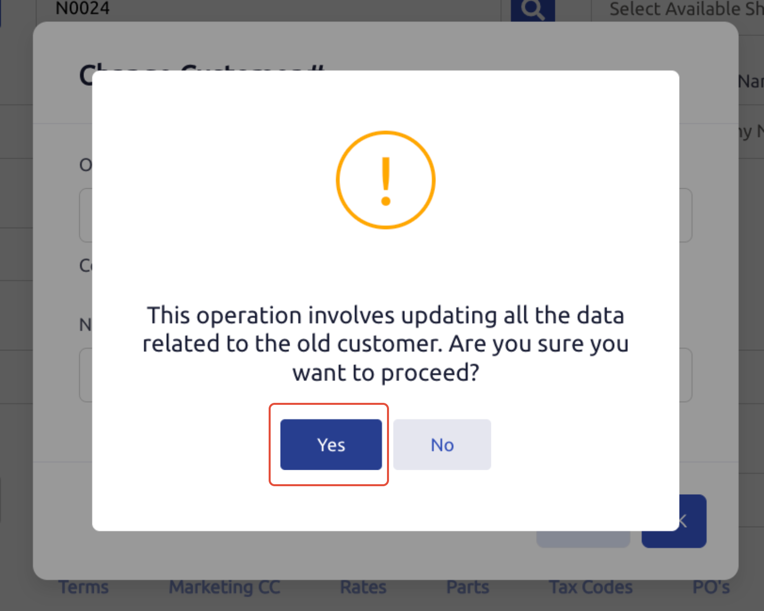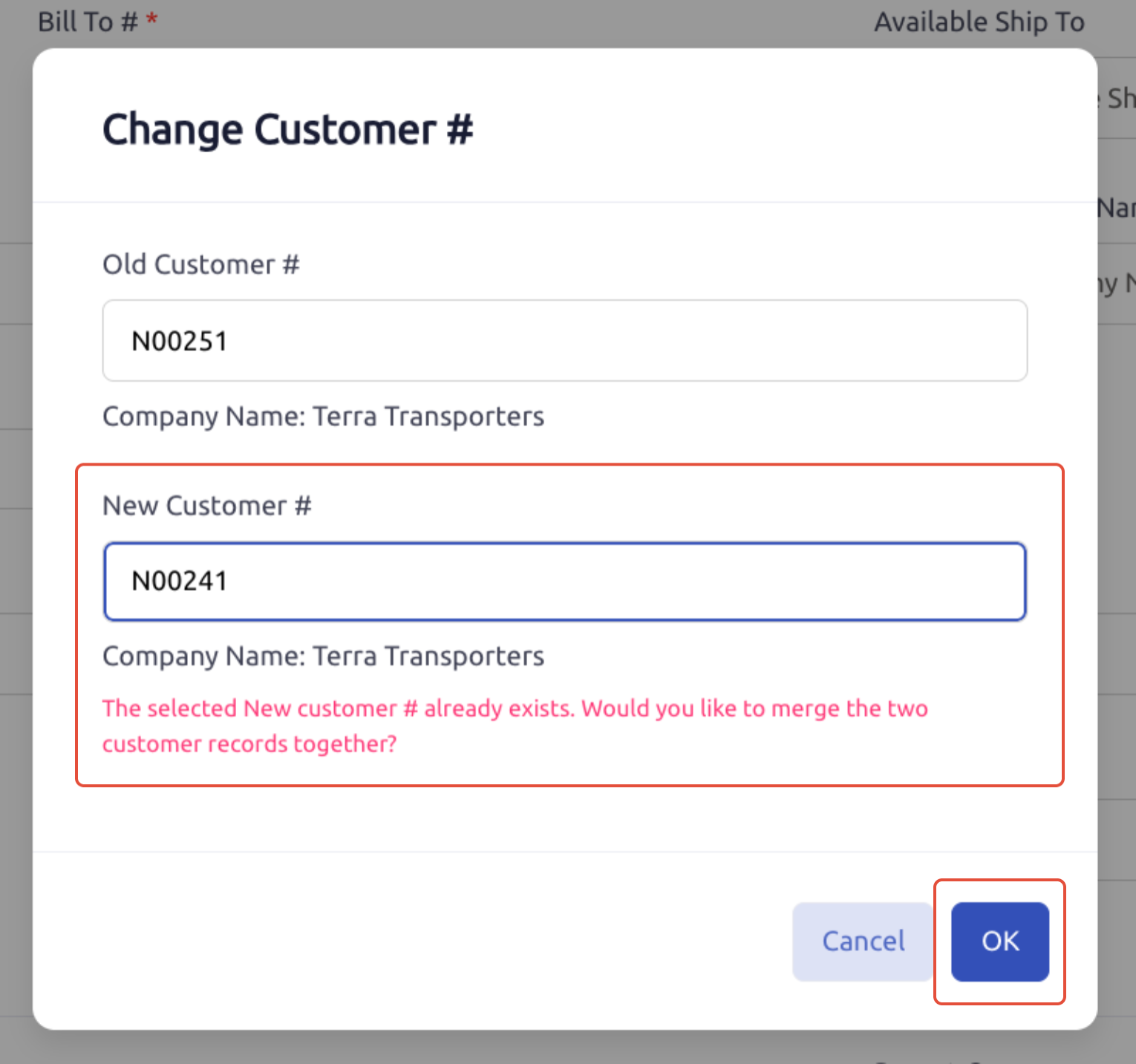 Note: Merging will consolidate the records under the existing customer #. Ensure you select the correct customer to avoid data loss.