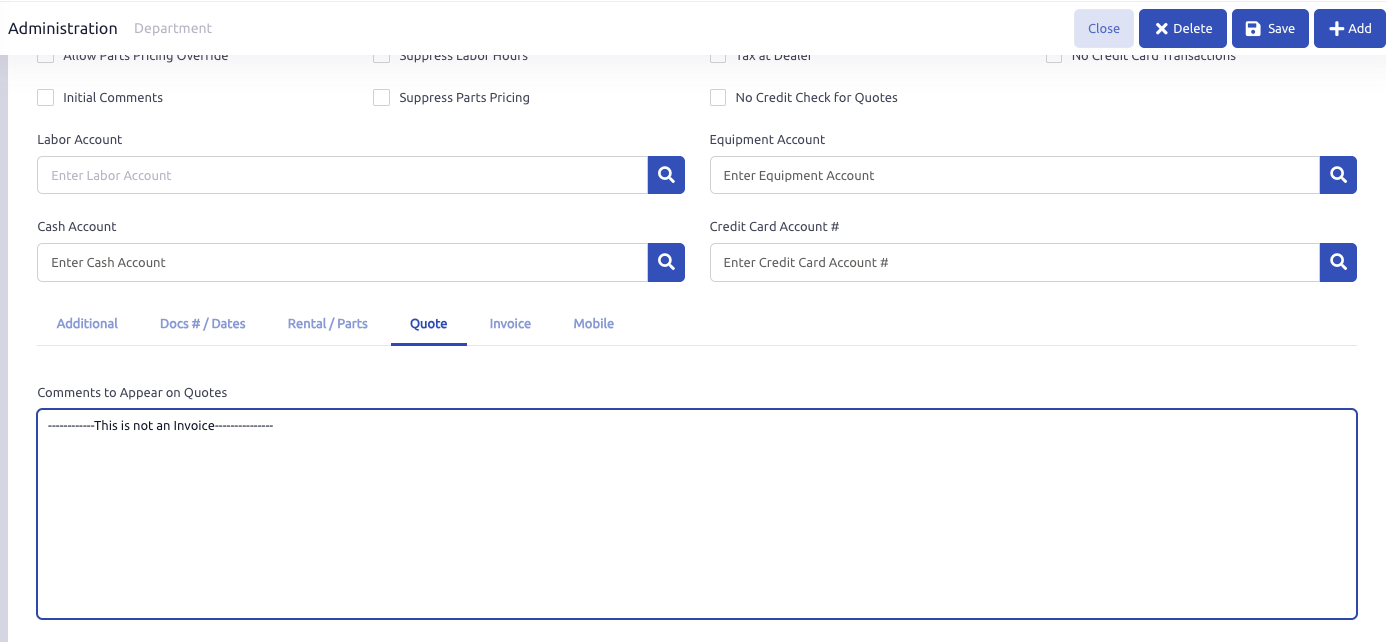 If you are looking to have a different comment or verbiage included, you can go to the Department Setup, under the Quote tab, and set the Comments to Appear on Quotes field to display the verbiage desired on quote documents.