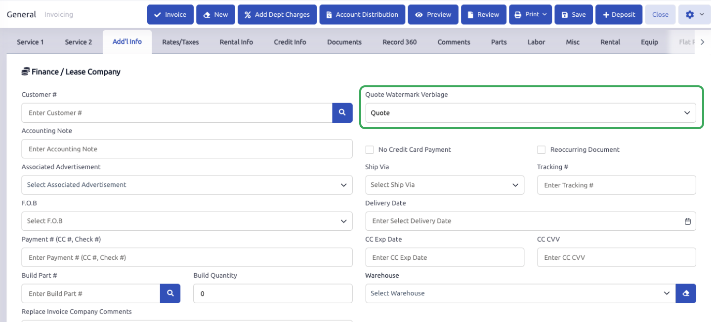 If you would like to change this for a specific document, you can navigate to the “Add’l Info” tab on the document, under the Quote Watermark Verbiage field, you can change the wording from “Quote” to “Estimate.”