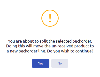 Clicking that 'Split BO' button will pop up a message that asks if I want to split the backorder and move the unreceived part to a new backorder line.