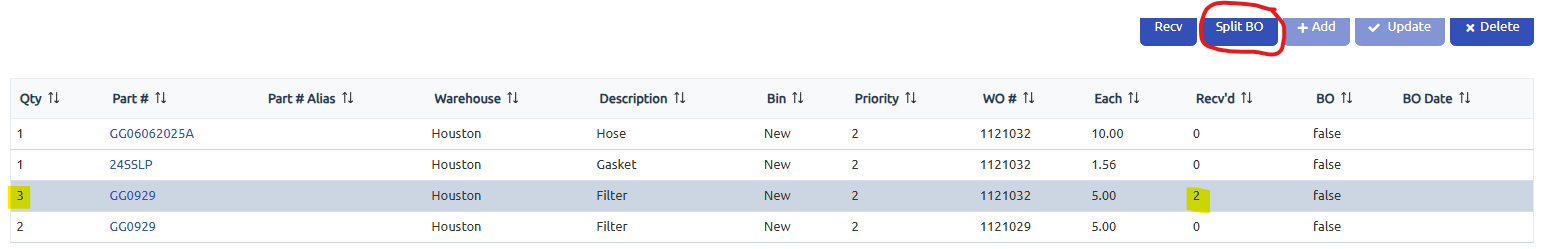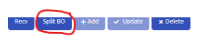 Now that I am back on the Parts tab in my purchase order after receiving my 2 parts, the Split BO button becomes enabled.