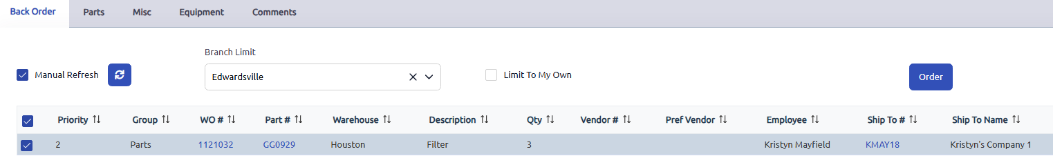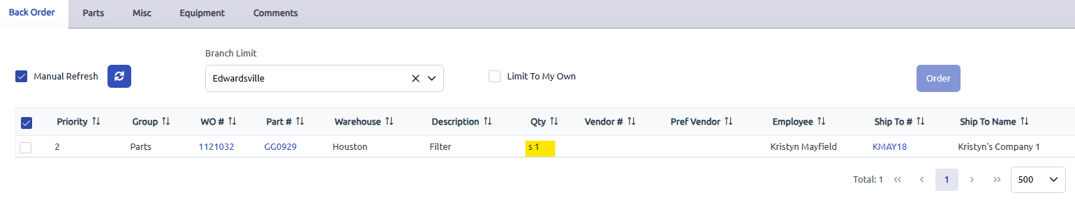 Saying yes will move that remaining part and qty of 1 back to the backorder tab and enables you to order again with a different purchase order. It will also display the qty with an 's' to designate that this order was 'split.'
