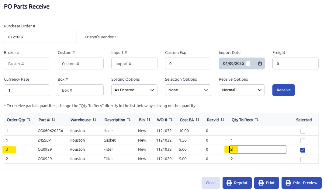 When I received the parts in, I only received 2. You can change the Qty To Recv in the PO Parts Receive screen by clicking in the box and editing the qty.