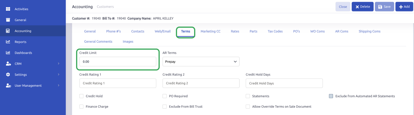 To adjust credit limits and/or AR terms for a customer, you can access and update as needed by going to Accounting > Customers, searching for the customer, then choosing the Terms tab. Here, you can adjust the credit limit or AR terms for that customer as needed.