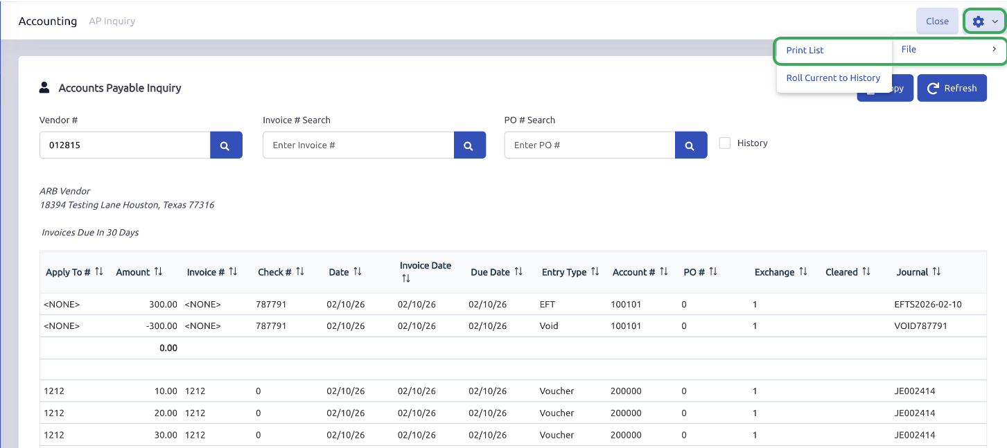 If you would like to print the open payables fora specific vendor, you can do so easily through AP Inquiry.