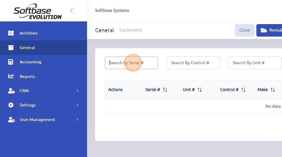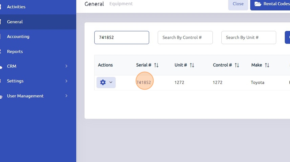 In the Equipment Program, click the "Search by Serial #" field and enter the serial number of the "child unit" or utilize the search function to locate it.
