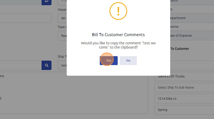 3. Once the new Bill To customer has been selected, the system might prompt you to copy any comments from the new customer's record.