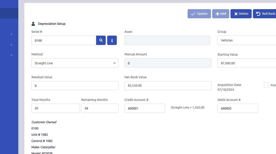 5. Enter the Residual Value of the Serial #. Residual value is the estimated value of an asset at the end of its useful life or lease term, after depreciation costs have been deducted.
