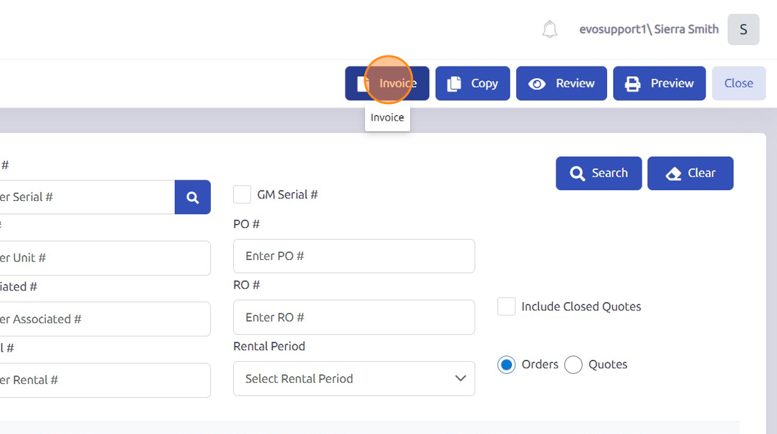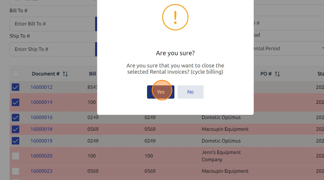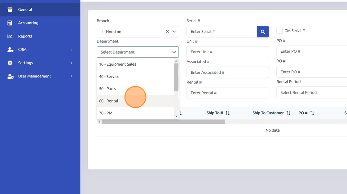 2. Select Branch and Department to view open documents for. Note: the Cycle Billing feature is only available for departments set to an invoice type of Equipment Rental (GM/Rental).