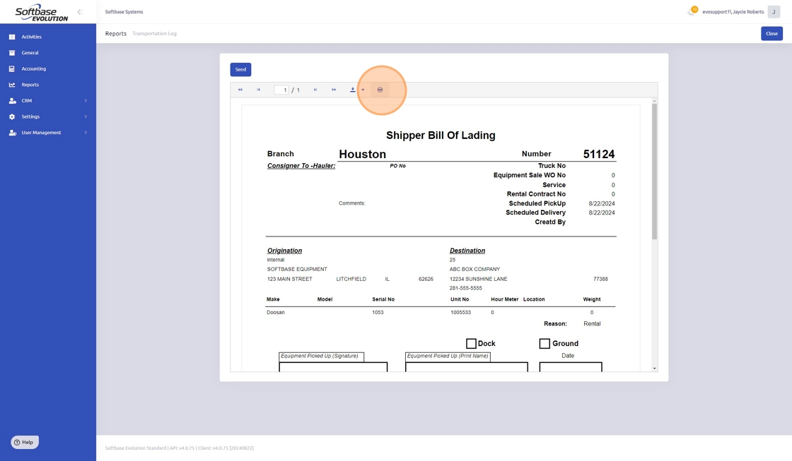 8. Once the bill of lading is generated, it can be printed for customer signature upon delivery or pick-up of the piece of equipment.