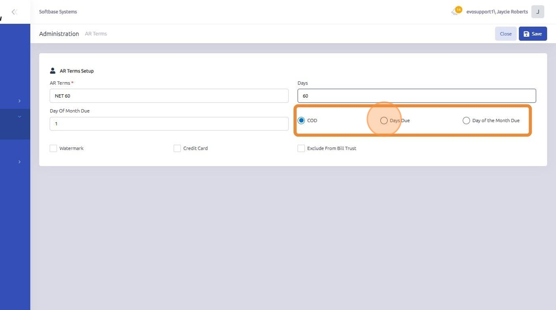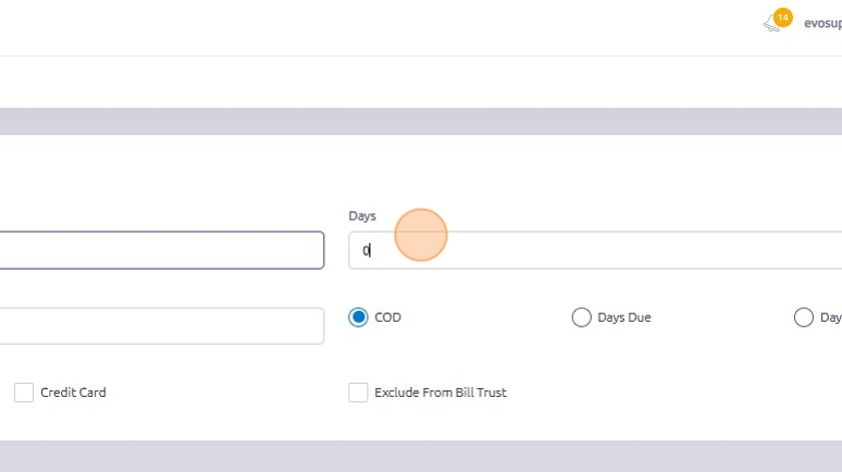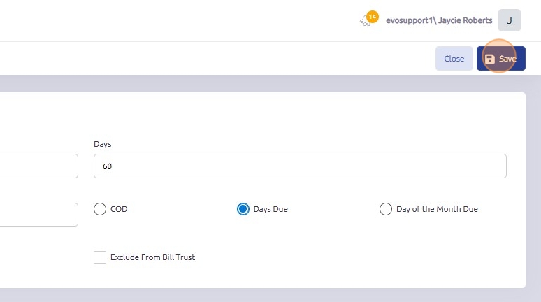 6. For customers with net terms, enter a value in either the Days or Day of Month field. The Days field specifies the number of days until the invoice is due (30, 60, 90). The Day of Month field is to be used when the invoice is due on a specific day of the month (1st, 15th).