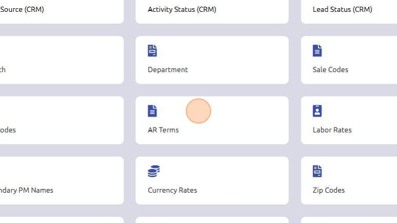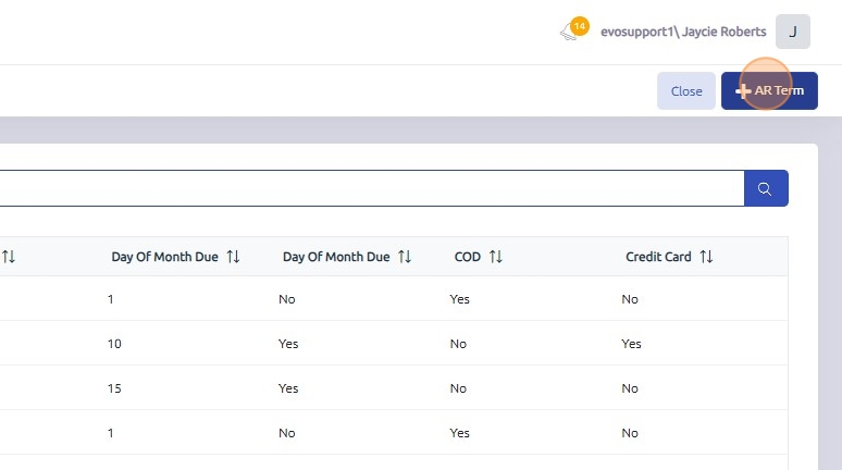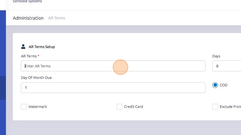 5. Click the "AR Terms" field and enter the name of the desired AR Term. For example, you might use terms like NET30, NET60, COD, Credit Card, etc.