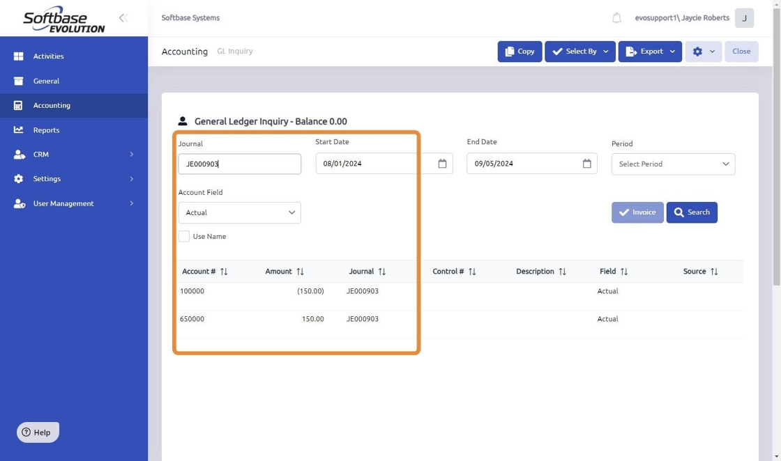 11. Once the Journal Entry is posted to the General Ledger you will see the balanced entry in the GL Inquiry program.