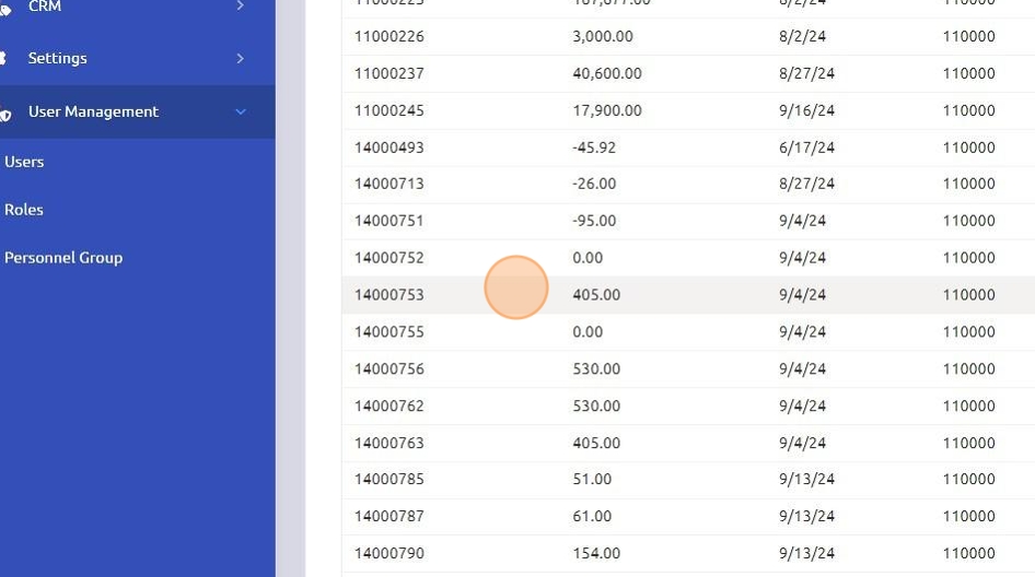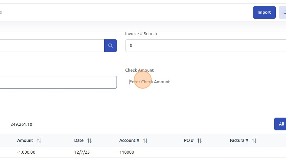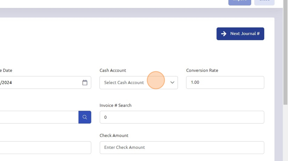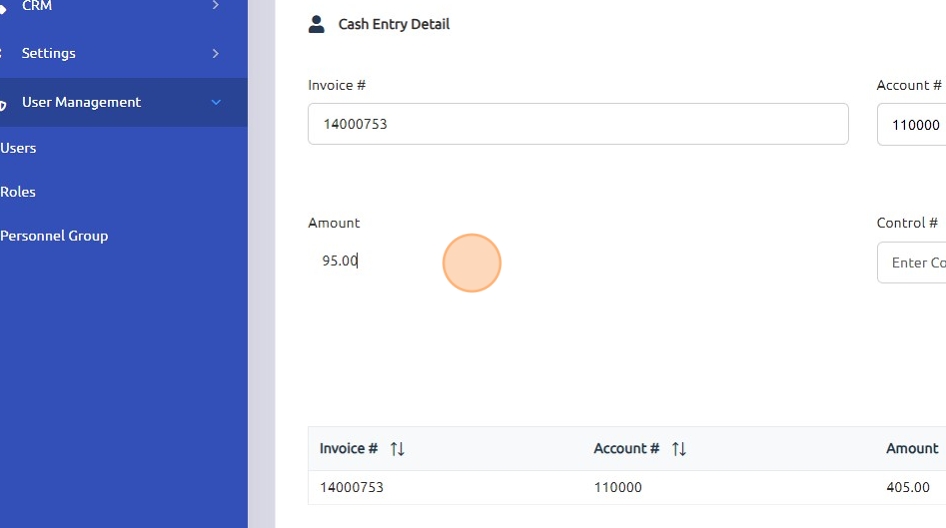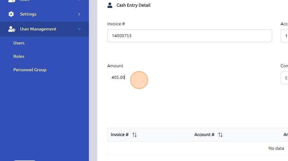 6. Once the invoice is selected, the invoice details and payment amount will appear in the Cash Entry Detail section.