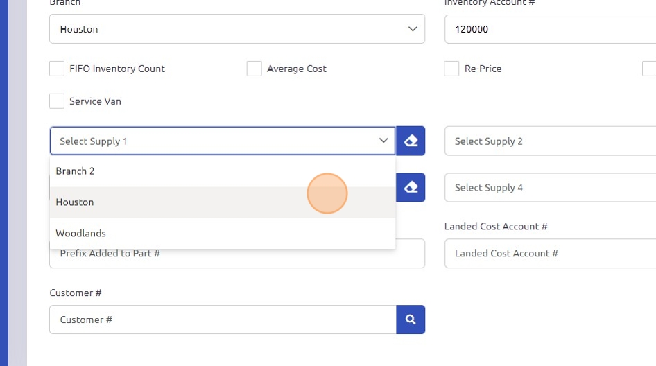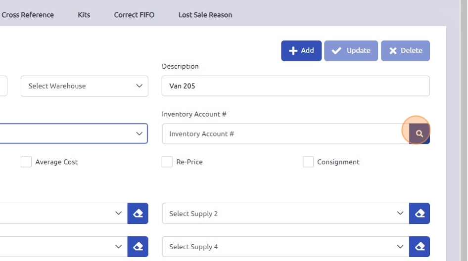 6. Enter or utilize the search function to select the correct parts inventory account associated with this van.