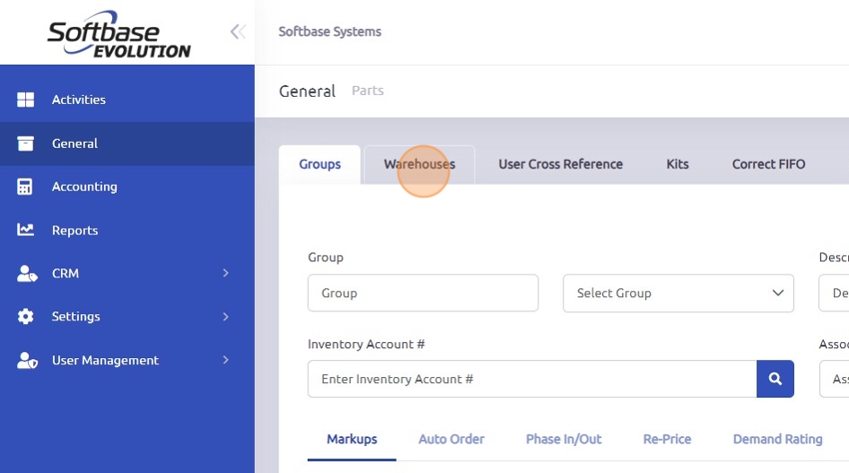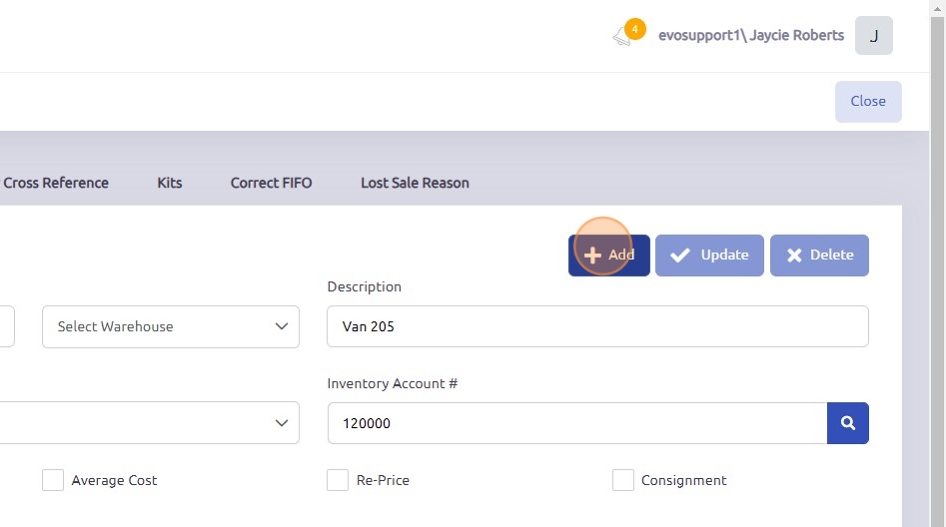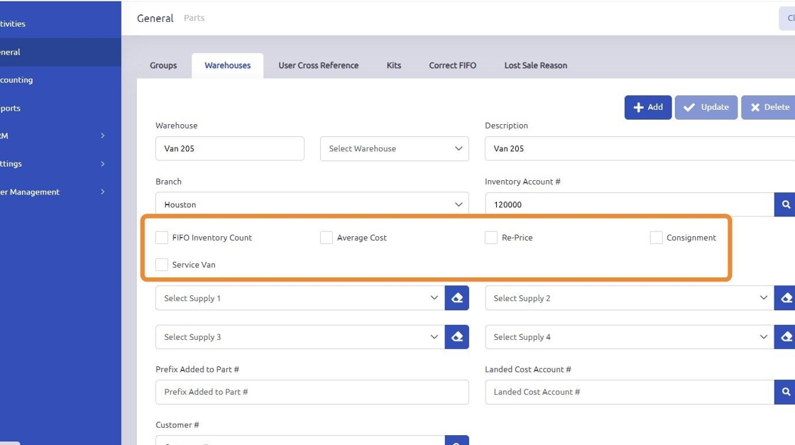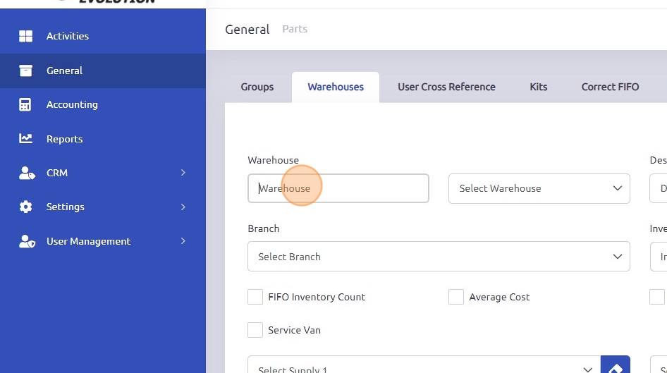 3. Click the "Warehouse" field and enter the service van number or name assigned.