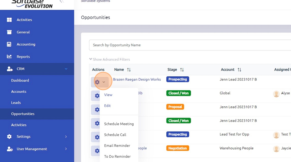 3. Click the Gear button to view or edit an existing opportunity, or to set up an activity tied to that specific opportunity.