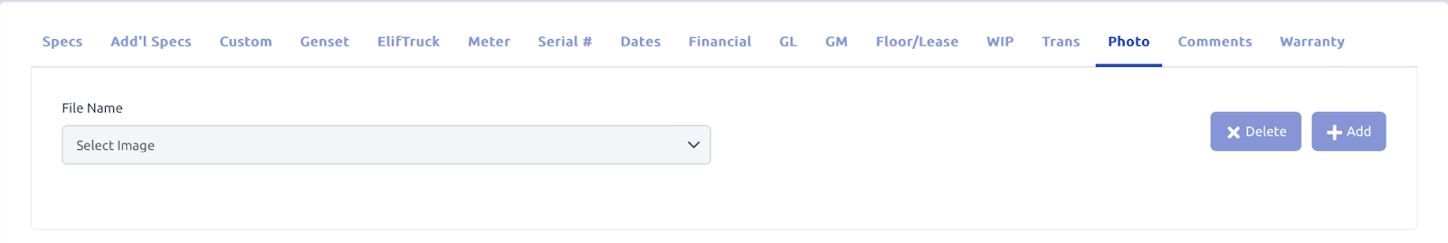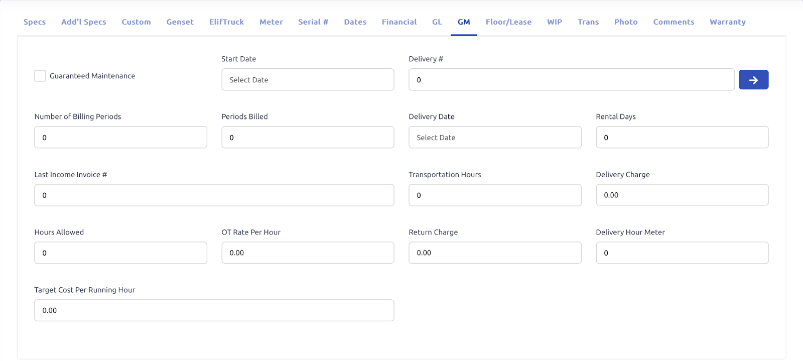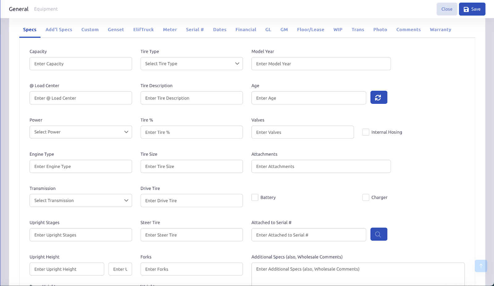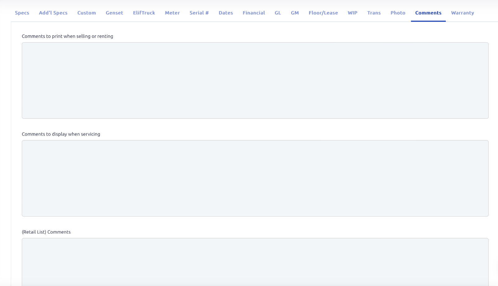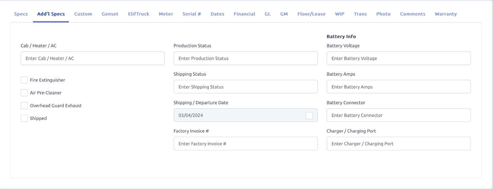 Here is where you can add additional information related to your equipment record. There are tabs for Specs, Add'l Specs, Custom, Genset, Eliftruck, Meter, Serial #, Dates, Financial, GL, GM, Floor, Lease, WIP, Trans, Photo, Comments, Warranty.