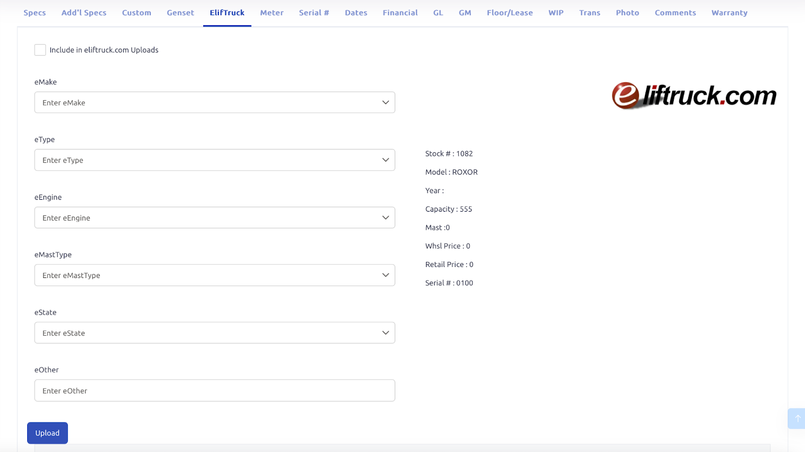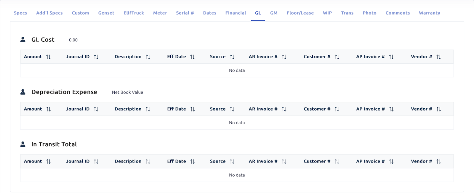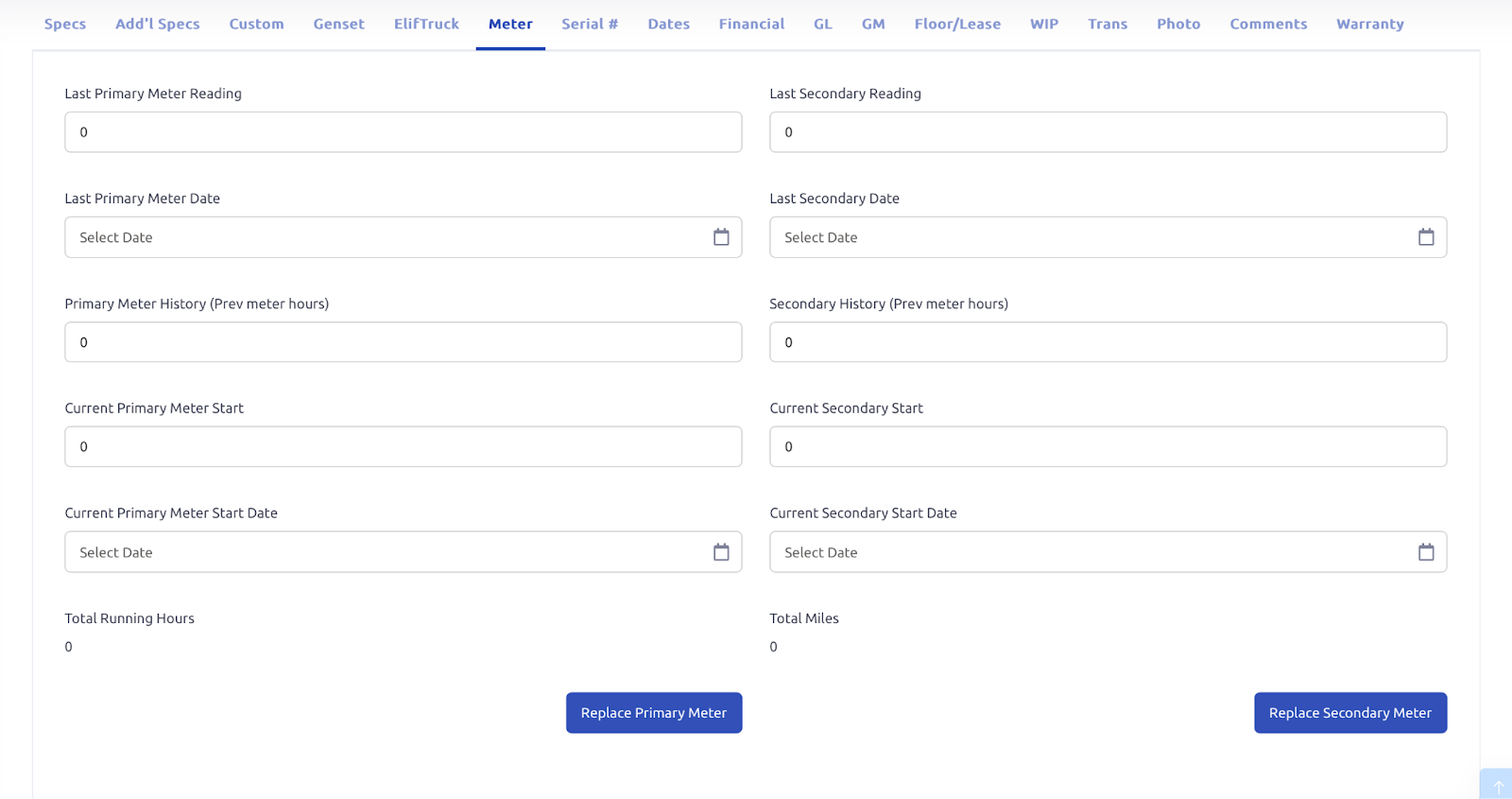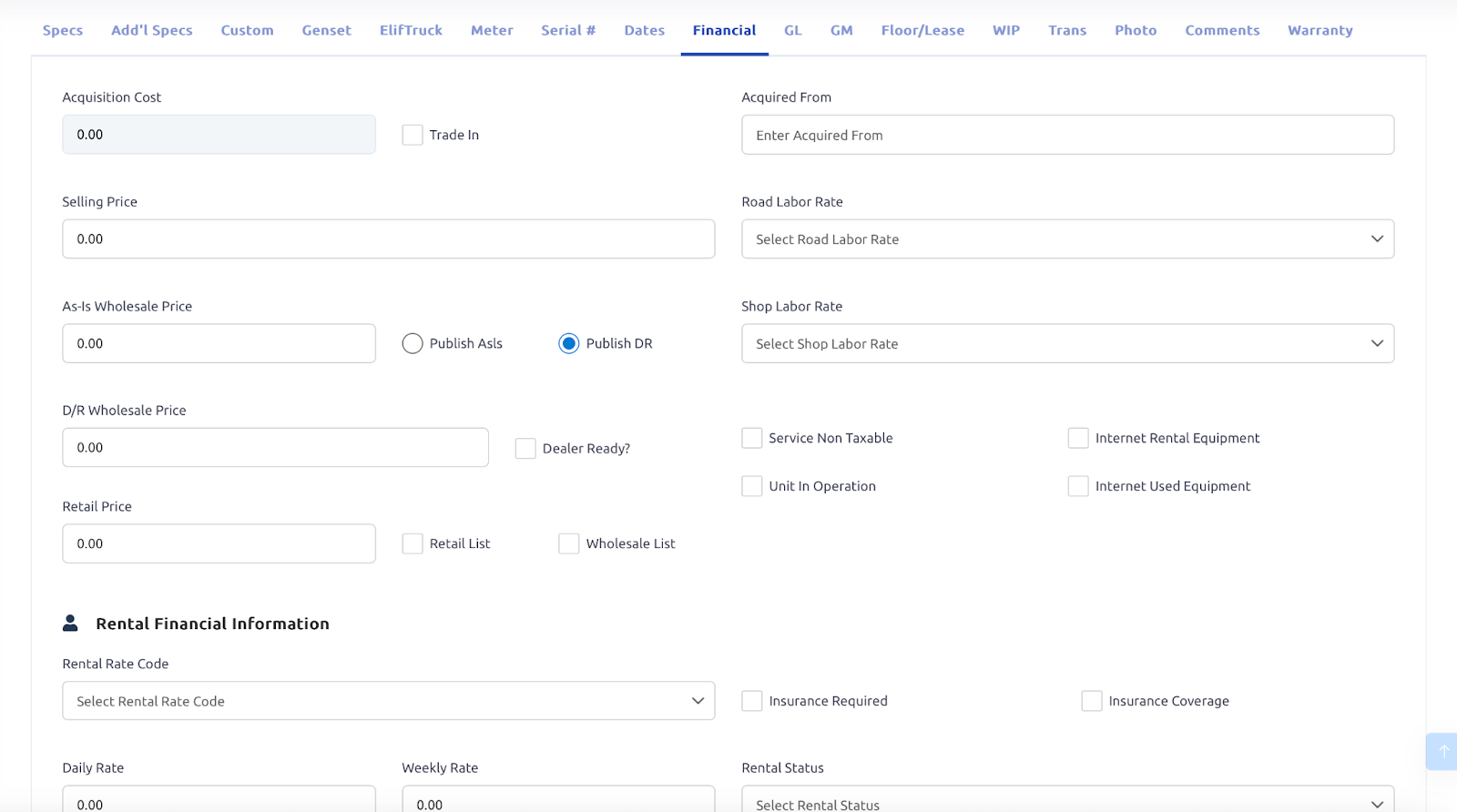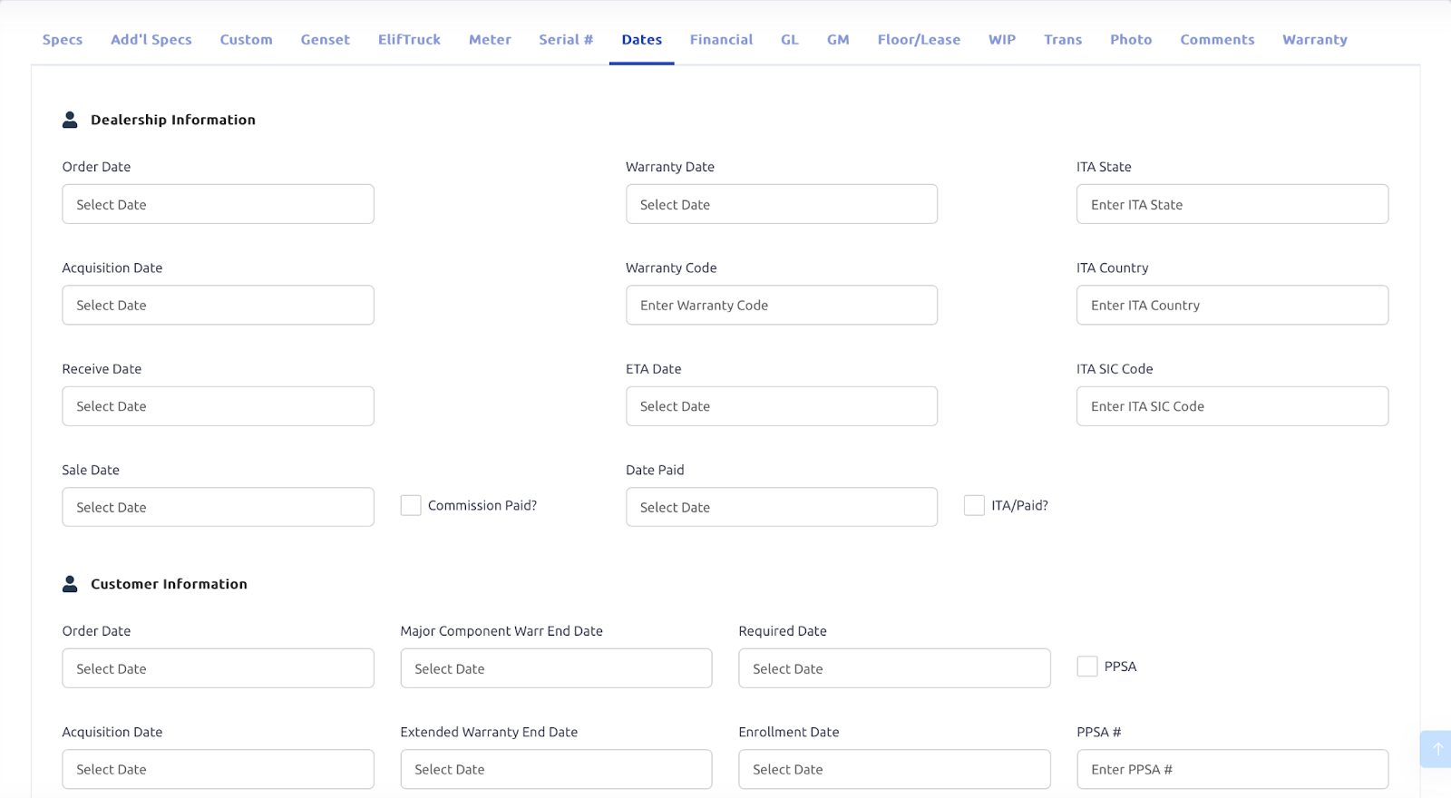 Here is where you can add additional information related to your equipment record. There are tabs for Specs, Add'l Specs, Custom, Genset, Eliftruck, Meter, Serial #, Dates, Financial, GL, GM, Floor, Lease, WIP, Trans, Photo, Comments, Warranty.