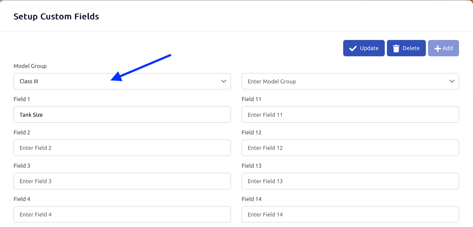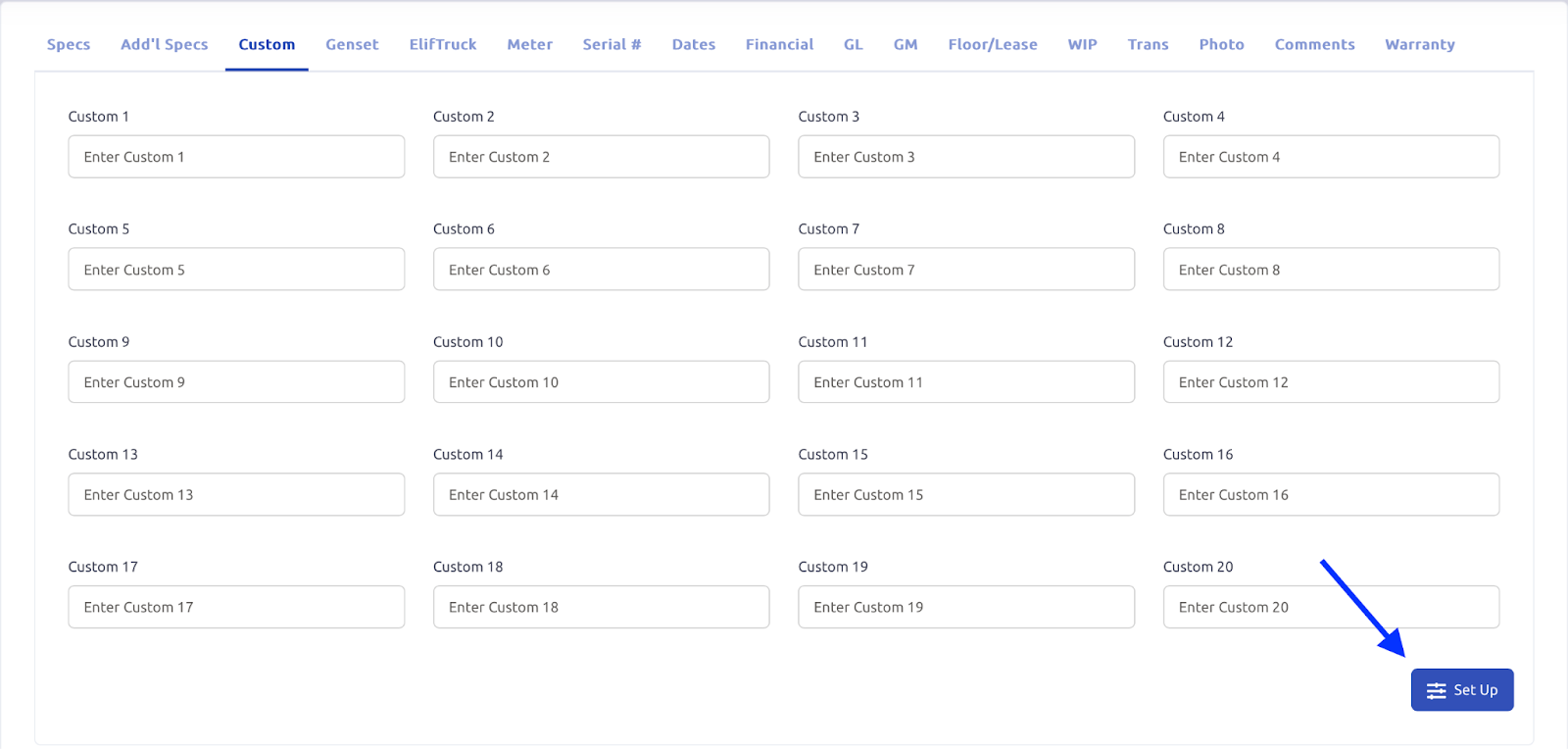 Setup Button: This button enables users to configure and label the 20 custom fields for each model group, tailoring them to specific needs or additional details required for the equipment.