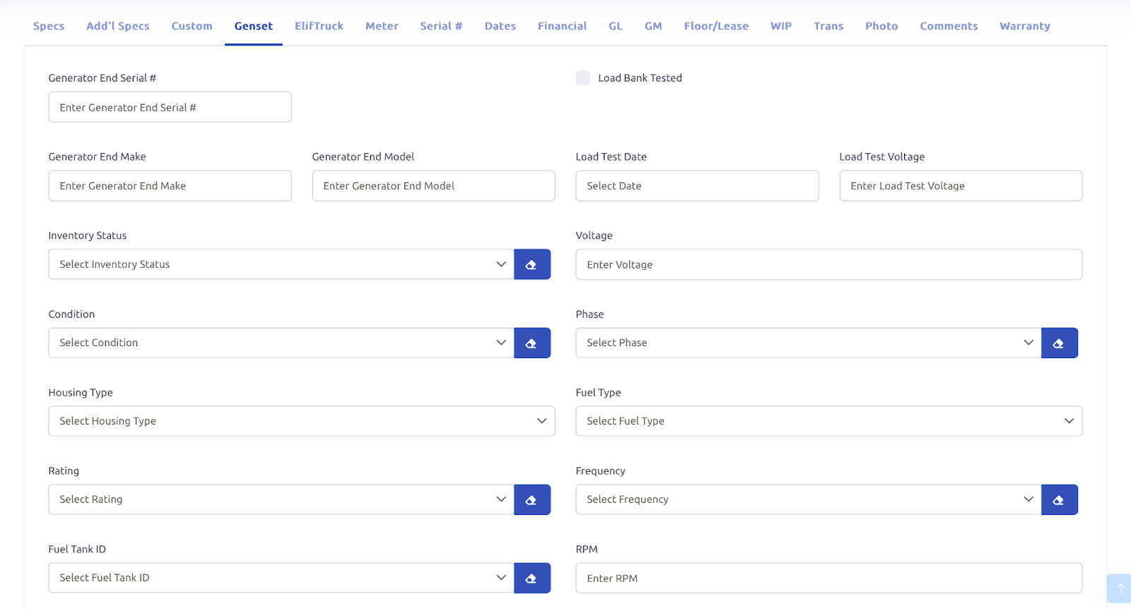 Genset Tab: This section is dedicated to tracking essential details about Generators, especially for equipment that involves generator units. Users can input and manage critical information related to the generator, covering aspects like serial numbers, status, condition, and technical specifications.